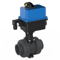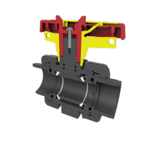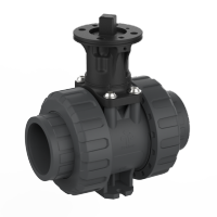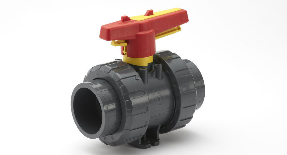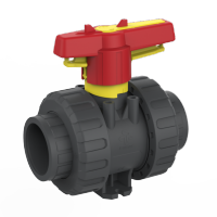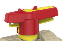 U herkent een handbediende kogelafsluiter van Praher Plastics aan het rode handvat en gele